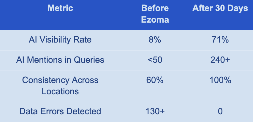 Ezoma’s case study proves that traditional SEO strategies must be paired with AI data transformation. For agencies managing hundreds of client locations, integrating Ezoma’s Local Data Exchange via API can automate this entire process, turning raw listings into AI-ready assets.This positions providers as leaders in the new frontier of AI-powered local visibility.